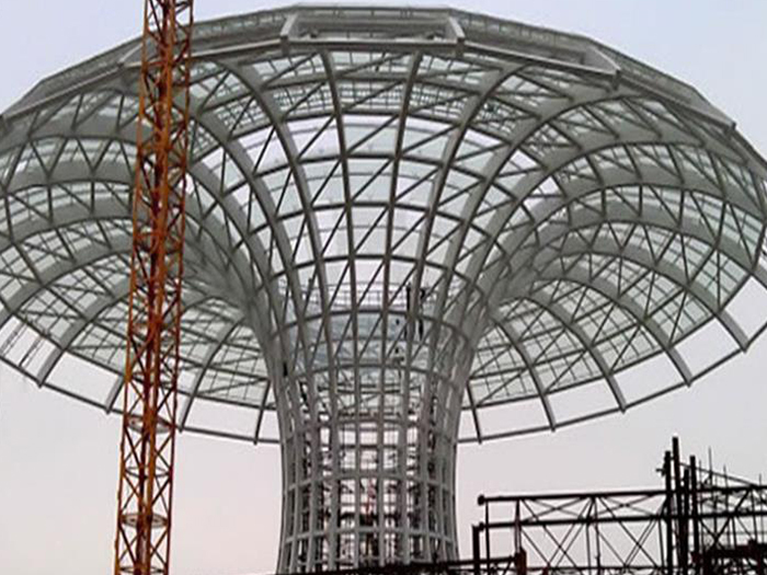 二、球形网架结构因其结构新颖,受力合理,自重轻、用钢量低等优点。如大型体育场馆球形攀枝花螺栓球网架、公共场馆球形网架、电厂攀枝花螺栓球网架、水泥工业球形网架、仓储物流球形网架、攀枝花干煤棚工业球形网架、攀枝花收费站攀枝花加油站球形网架、展览中心、影剧院、商场、航站楼、候车厅、工厂攀枝花车间、仓库、电视塔等球形螺栓球节点网架。国内球形网架结构主要分为:攀枝花焊接球节点网架及螺栓球节点网架两种。螺栓球节点网架其构件工厂内加工量较大,现场安装便捷,适用于现场工期紧,攀枝花施工条件、用电量受制约,网架形状复杂、攀枝花杆件定位困难的异形结构。螺栓球节点球形网架系统基本由攀枝花杆件、螺栓球、支撑支座等组成。按照节点形式可分为交叉攀枝花桁架体系、四角锥体系、三角锥体系等。支撑方式多为固定支座支撑。对于大面积、大跨度及有特殊受力或伸缩要求的网架结构可采用橡胶支座、滑移支座、球铰支座等支撑形式,以满足结构自身的受力稳定、均衡,便于内力释放等设计要求。